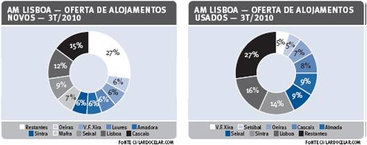 Em termos geográficos, cerca de 50% da oferta metropolitana de fogos usados concentra-se nos concelhos de Lisboa, Sintra, Seixal e Almada, com valores neste segmento a oscilarem entre os 2.500€/m² em Lisboa e 1.270€/m² no Seixal. Já no caso dos alojamentos novos, verifica-se uma menor concentração, destacando-se Cascais, com 15% destes fogos e Lisboa com 12%. O valor médio da oferta de fogos novos atinge o seu máximo no concelho de Lisboa (3.140€/m²) e o mínimo na Moita (1.240€/m²).